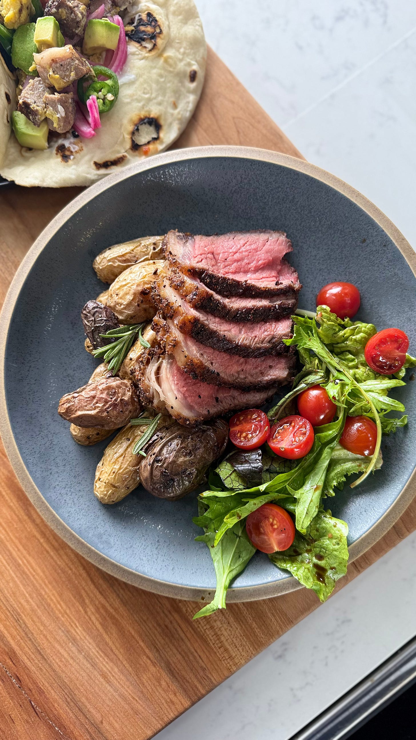 As the cameras start rolling, it’s a blend of precision and play. The NY strip steak hits the pan, that first sizzle filling the room, and suddenly everyone’s locked in. There are the classic food commercial tricks—brushing on extra oil for shine, tweaking angles to make the sear look just right—but there’s also real cooking happening. I’m not about smoke and mirrors. The steak gets flipped, rested, sliced, and plated—all of it real. The goal is to showcase the food in a way that is both visually appealing and authentic to the cooking process.