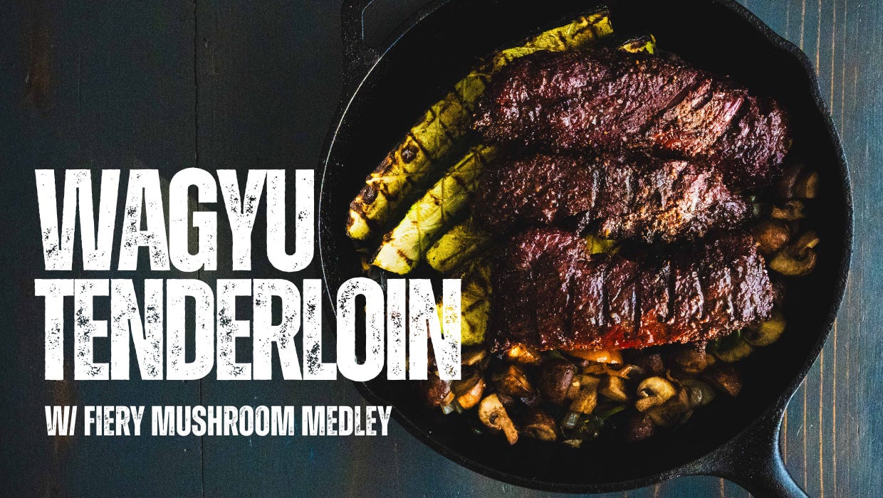 Smoked Wagyu Beef Tenderloin with Spicy Mushroom Medley and Grilled Zucchini